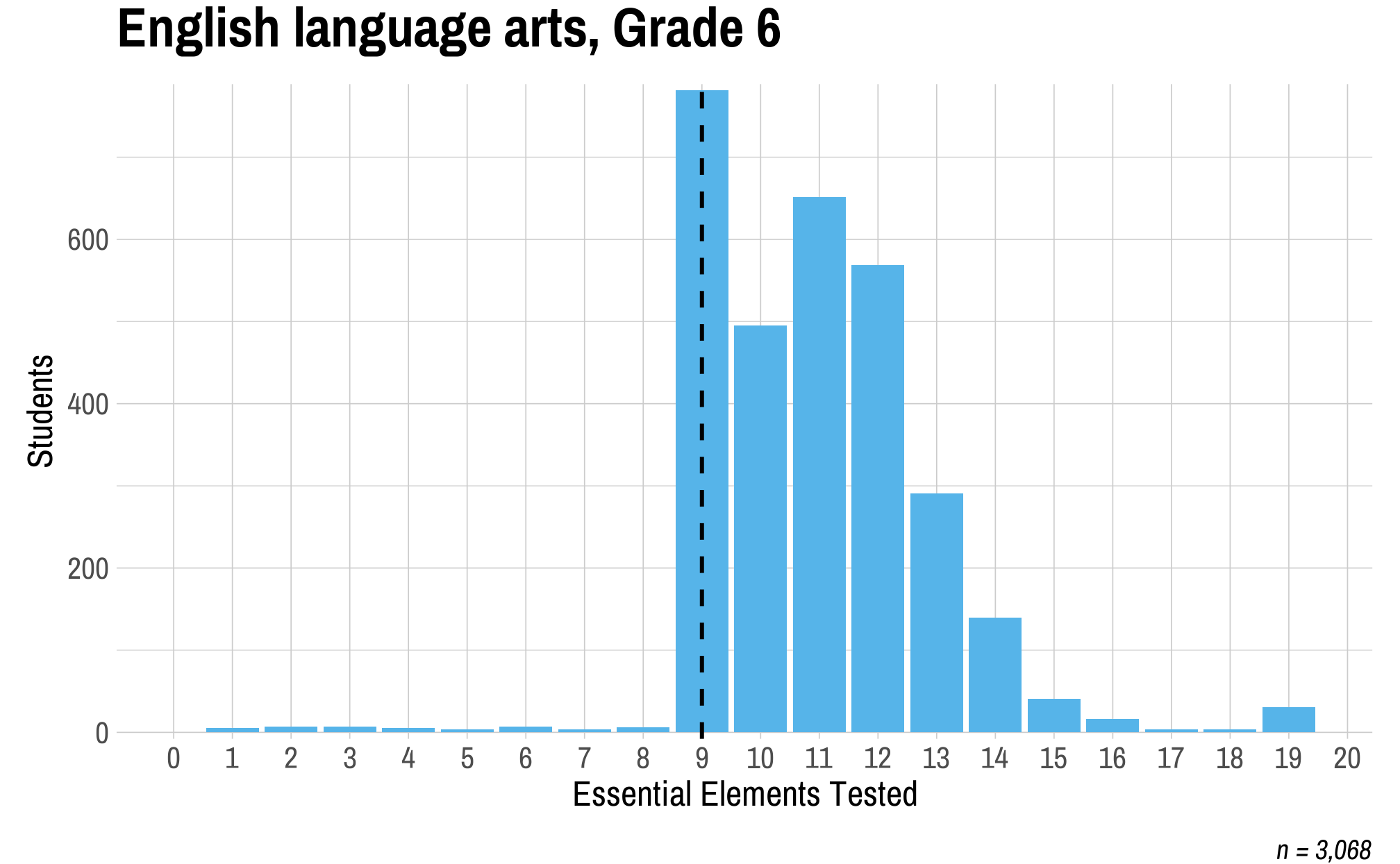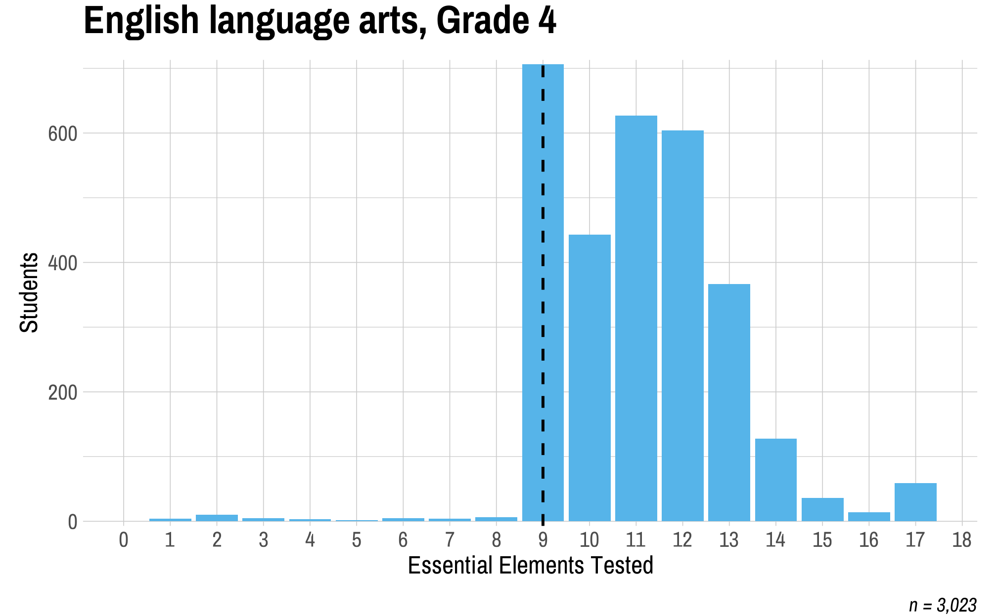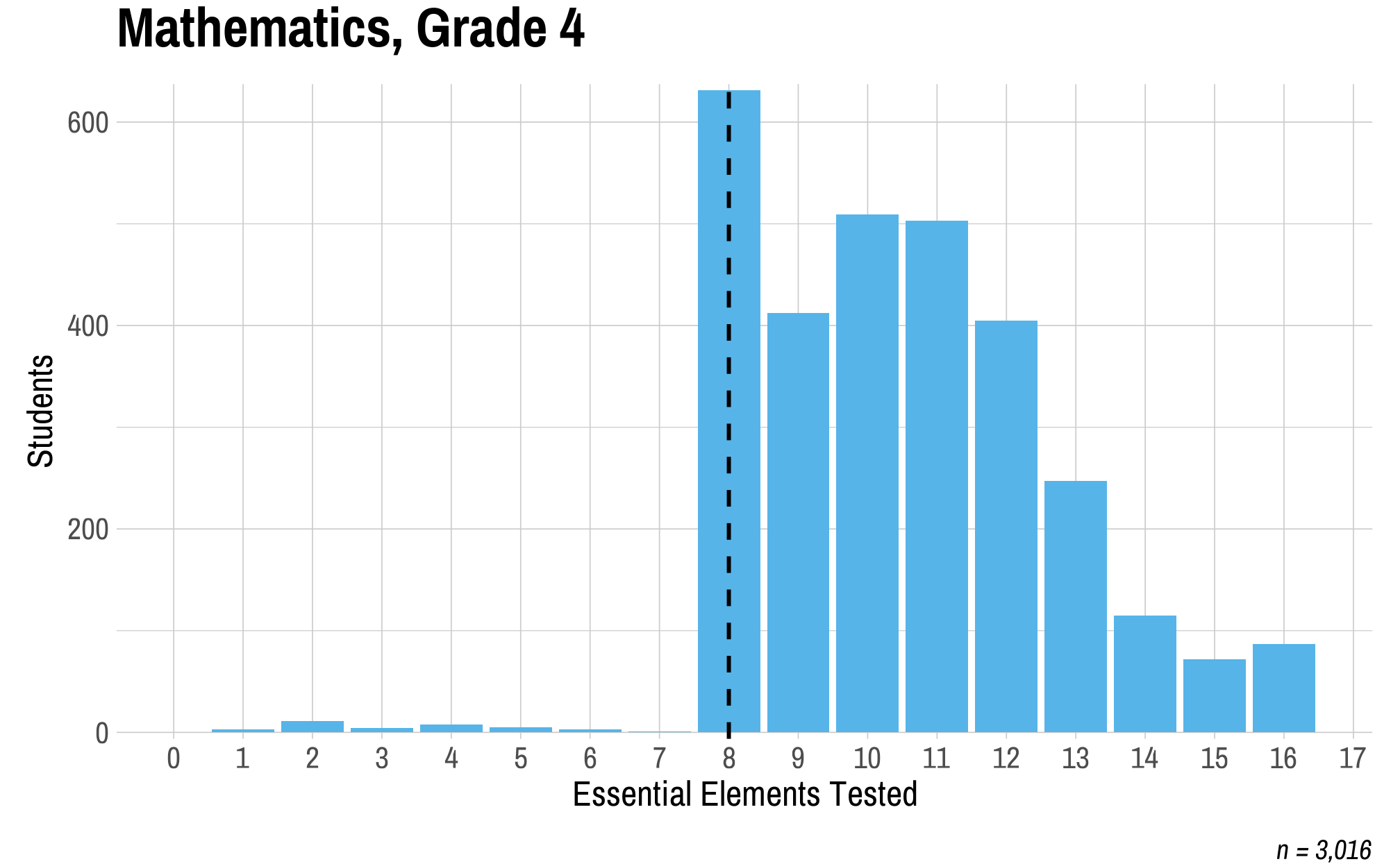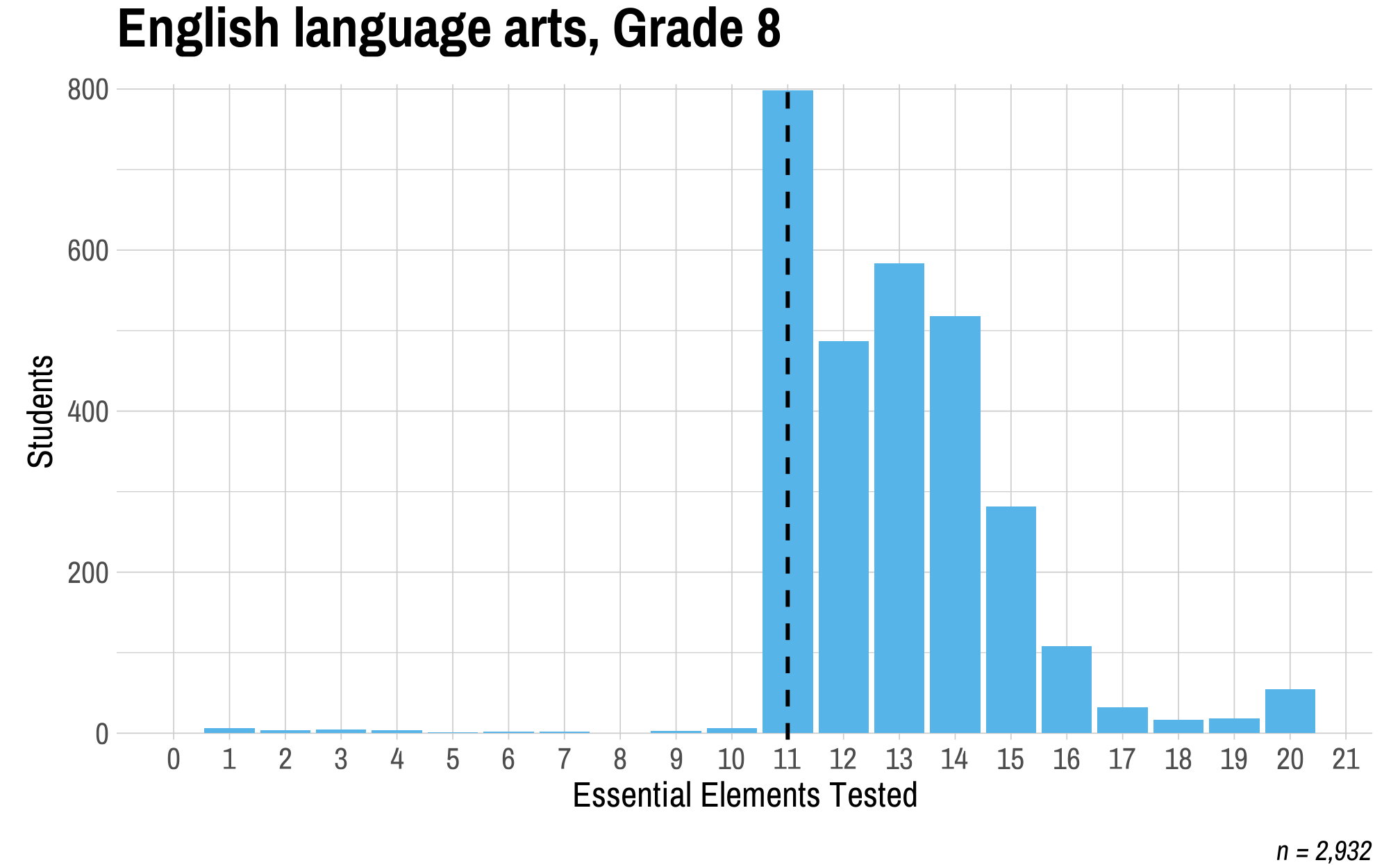 The figures in this section show the distribution of the number of unique Essential Elements (EEs) that each student tested on. The dashed line indicates the number of EEs needed to meet the blueprint requirements.