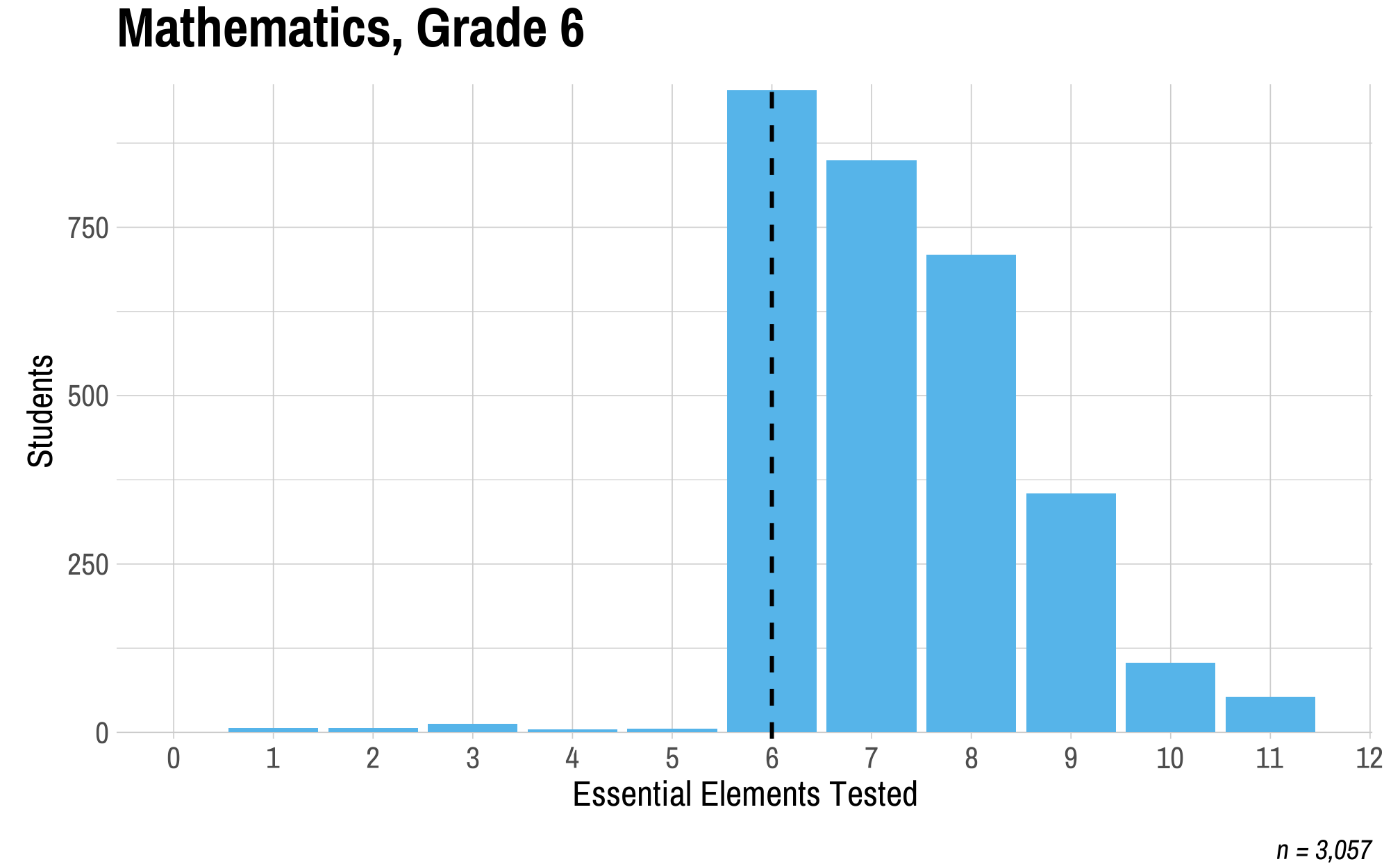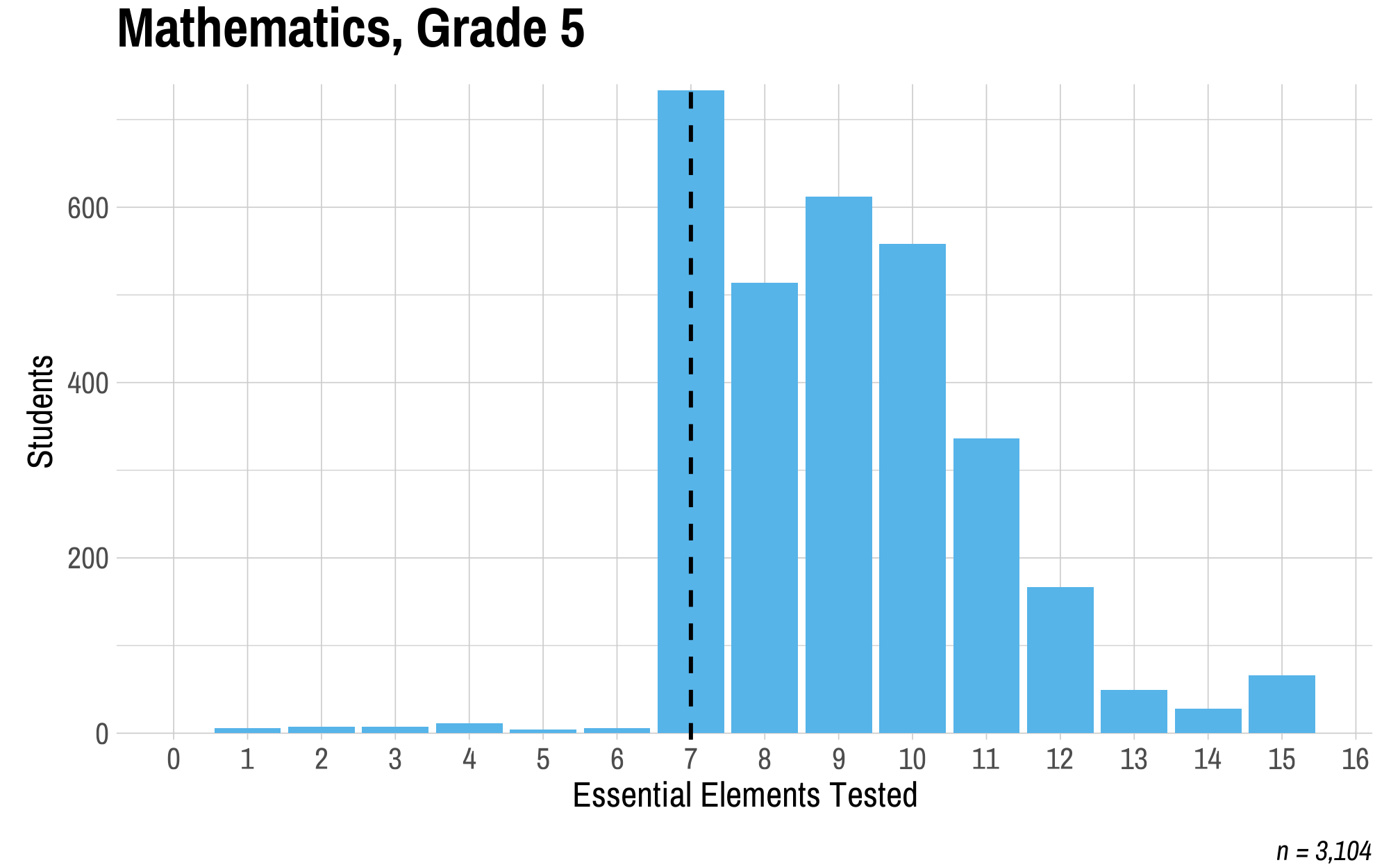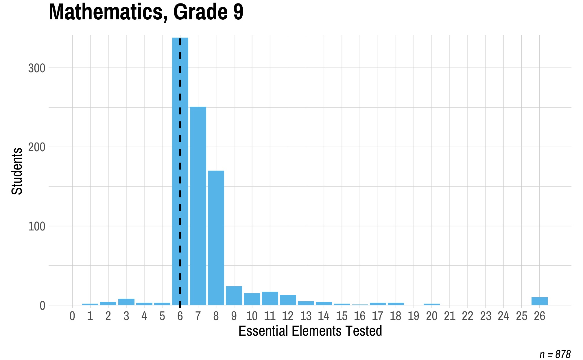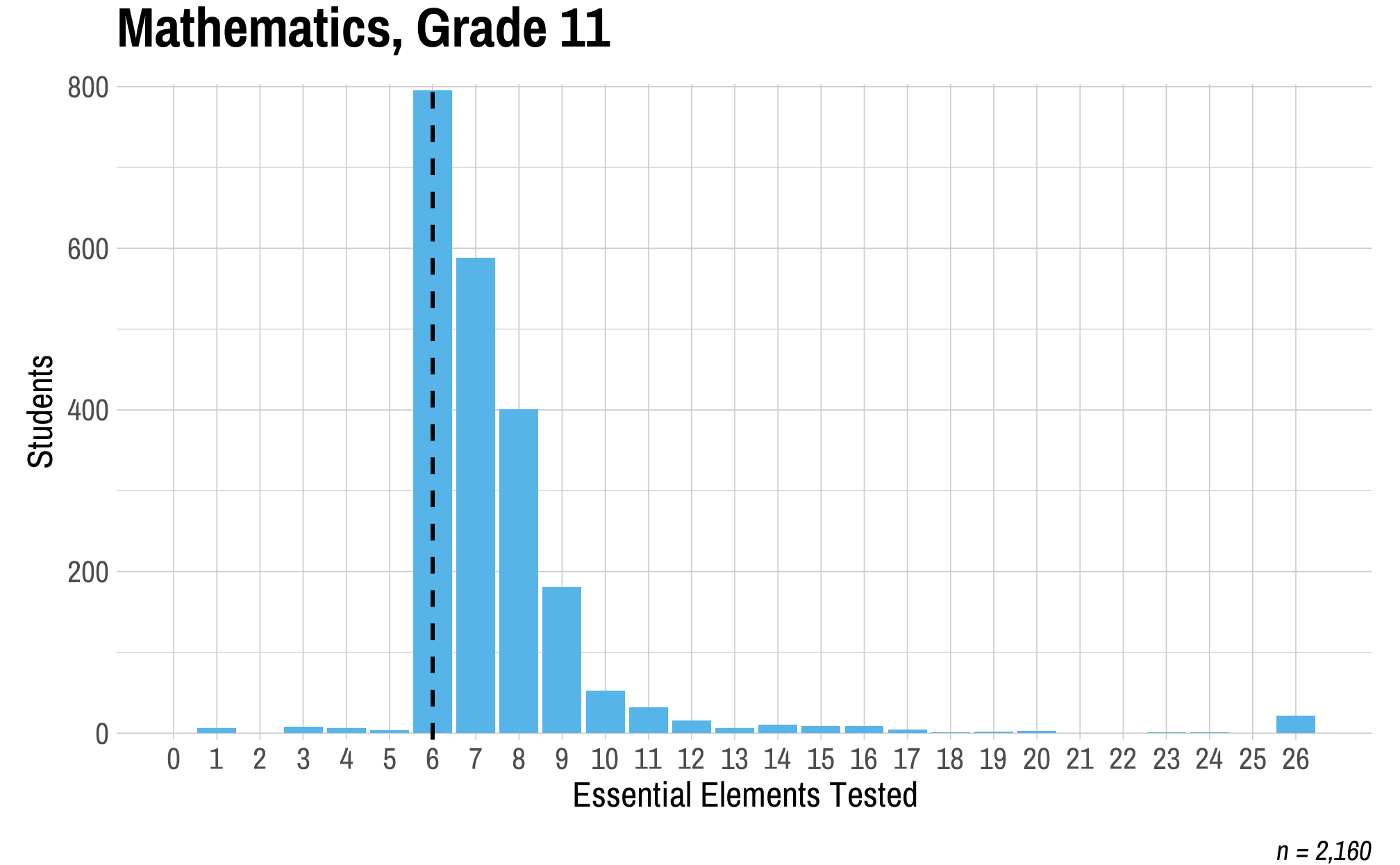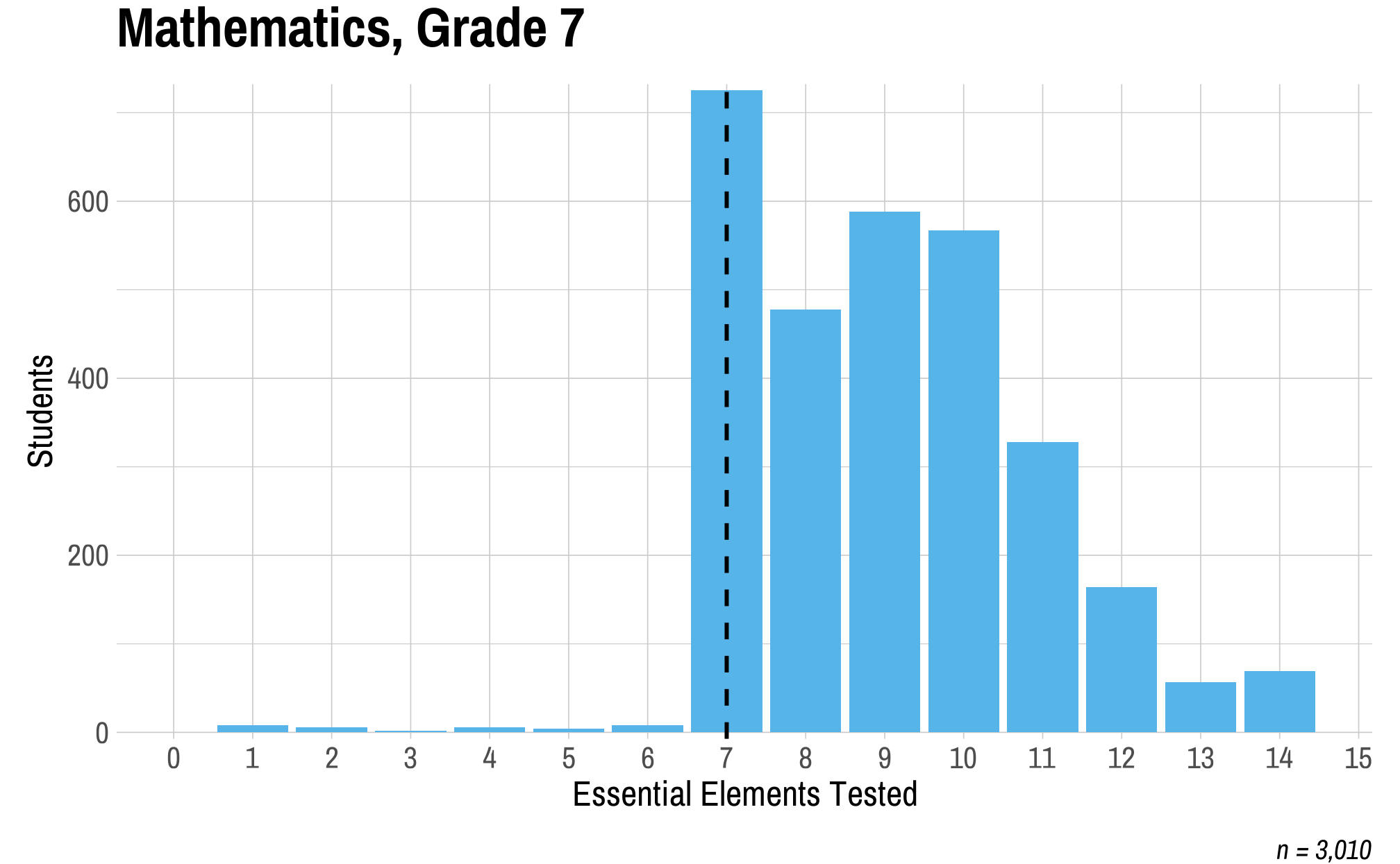 The figures in this section show the distribution of the number of unique Essential Elements (EEs) that each student tested on. The dashed line indicates the number of EEs needed to meet the blueprint requirements.