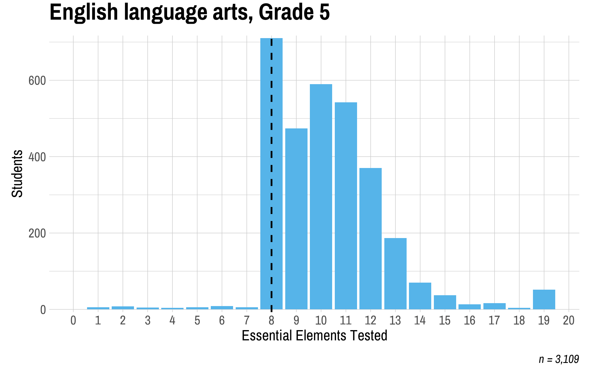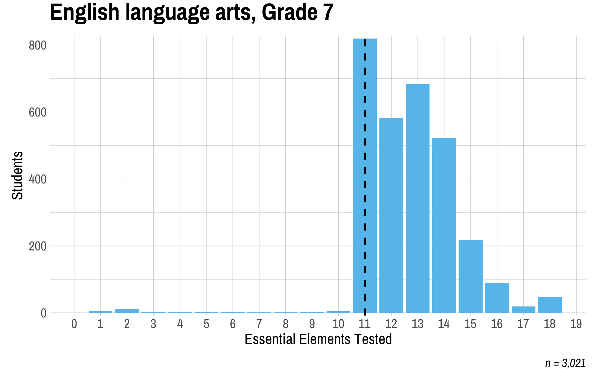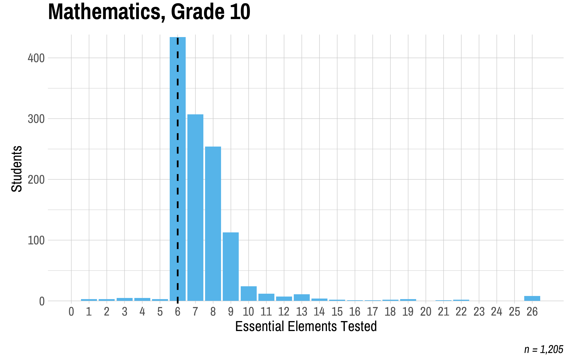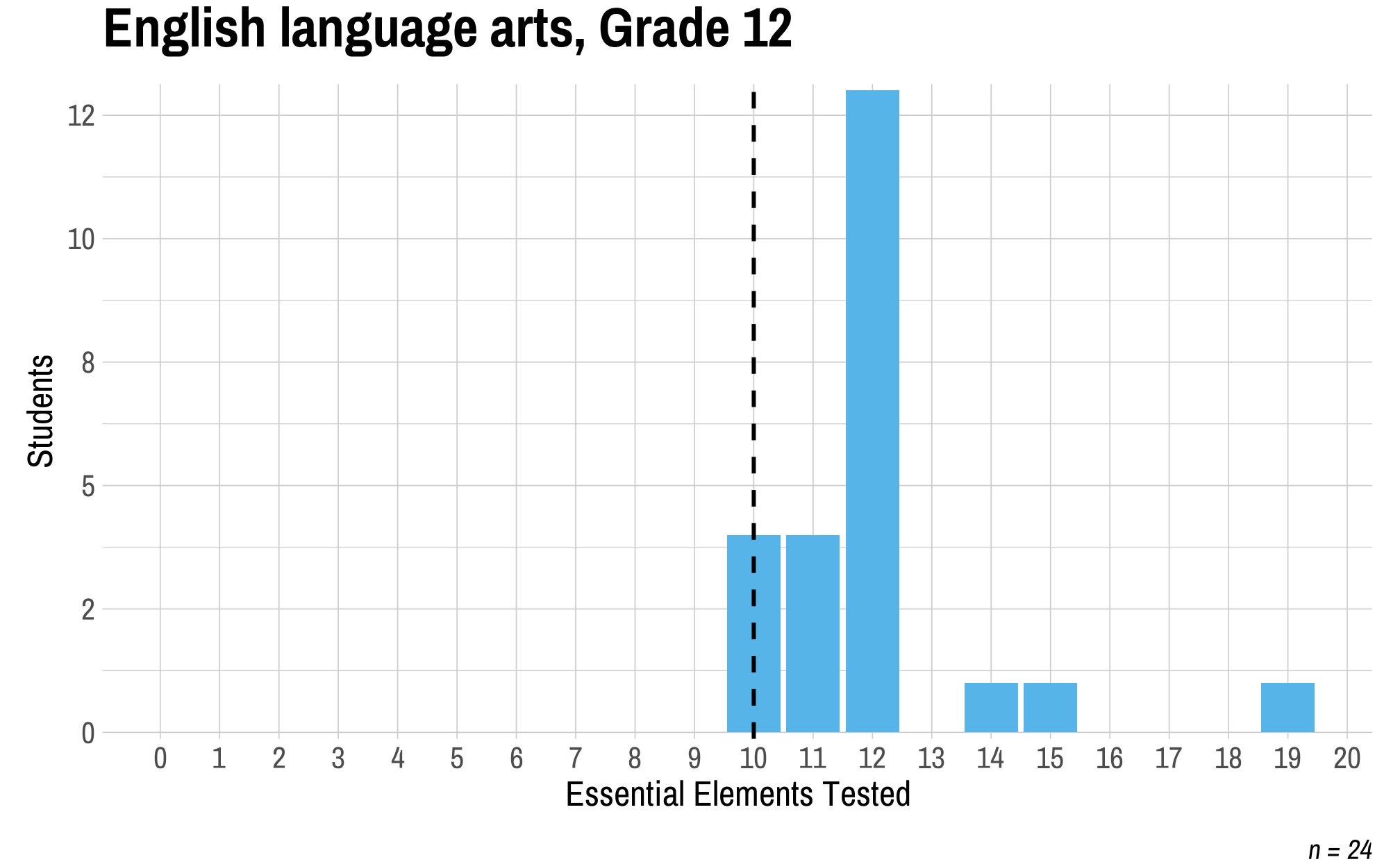 The figures in this section show the distribution of the number of unique Essential Elements (EEs) that each student tested on. The dashed line indicates the number of EEs needed to meet the blueprint requirements.